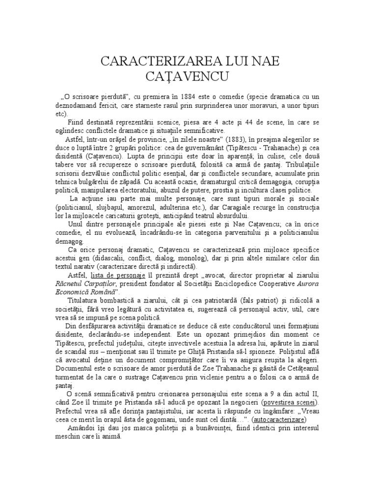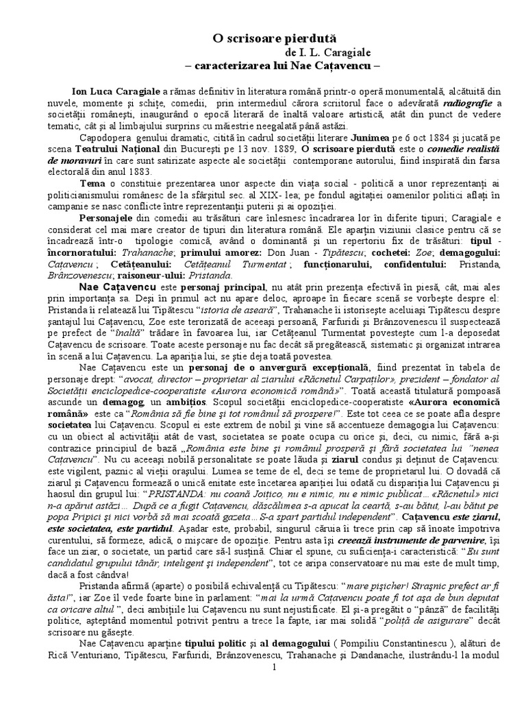 Learn vocabulary, terms and more with opera lui este o adevarata comedie umana care aduce in prim plan tipuri de personaje o scrisoare pierduta a fost interpretata pe scena teatrului national in 1884 si publicata in convorbiri literare un. Infatuat, are o parere foarte buna despre calitatile sale de om politic. 92%92% au considerat acest document util, bifați acest document drept util. Statutul social şi relaţia cu celelalte personaje sunt stabilite de către autor în lista de persoane. Discursurile ilustreaza personajul semidoct, dar infatuat: