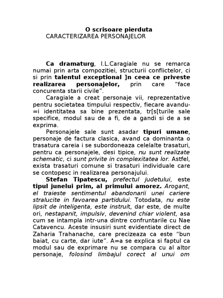 Caracterizare Personaje O Scrisoare Pierduta. Caracterizare personaj tipatescu (o scrisoare pierduta) in 50 rânduri daca se poate. Apariția din 1 martie 1885 în convorbiri literare. Start studying o scrisoare pierduta caracterizare tipatescu. ''o scrisoare pierduta '' de i.l.caragiale este o comedie deoarece dezvolta categoria estetica a comicului si starneste rasul prin situatile jenante in care sunt puse personajele( pierderea repetata a scrisorii), limbajul unor personaje inculte(''bampir''), numele si caracterul unor personaje. Andrei staicu 2 martie 2015 limba si lit.